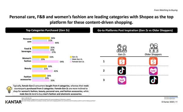 จากผลการวิจัยพบว่าเมื่อผู้บริโภค Gen Z ได้ตระหนักถึงปัจจัยดังกล่าวแล้วนั้น ก็มองหาช่องทางที่ตอบโจทย์ที่สุดในการเลือกซื้อสินค้า โดยรายงานระบุว่า Shopee เป็นแพลตฟอร์มอันดับแรกที่ Gen Z ใช้ทั้งในการค้นหาไอเดียและตัดสินใจซื้อสินค้า รองลงมาคือ TikTok Shop และ Lazada