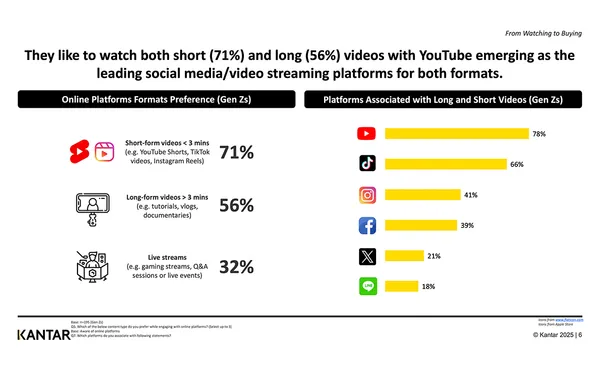 จากผลวิจัยแสดงให้เห็นว่า ผู้บริโภค Gen Z เปิดรับสื่อวิดีโอที่หลากหลาย สั้น-ยาว สลับกันไปมา การใช้วิดีโอสั้นเข้ามาดึงดูดความสนใจเพื่อนำไปสู่การรับชมคอนเทนต์วิดีโอยาว กำลังจะกลายมาเป็นมาตรฐานใหม่ที่ Gen Z มองหา นักการตลาดจึงควรวางกลยุทธ์การสื่อสารที่ครอบคลุมรูปแบบของเนื้อหาและช่วงเวลาที่เหมาะสมและถ้าวัดกันด้วยเรื่องแพลตฟอร์มครองใจ YouTube ถือเป็นแพลตฟอร์มชั้นนำที่รองรับรูปแบบเนื้อหาวิดีโอทั้งแบบสั้นและยาว โดยผู้บริโภค Gen Z ชื่นชอบถึง 78% รองลงมาคือ TikTok, Instagram, Facebook