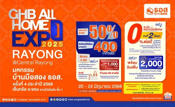 ธนาคารอาคารสงเคราะห์ (ธอส.) ร่วมขับเคลื่อนเศรษฐกิจไทย ผ่านภาคอสังหาริมทรัพย์ จัดทรัพย์เด่น ทำเลดี ราคาน่าจับจองทั่วประเทศ ลดสูงสุด 50% กับ “มหกรรมบ้านมือสอง GHB ALL HOME EXPO ประจำปี 2568 ครั้งที่ 4“ ระหว่างวันที่ 20 – 22 มิถุนายน 2568 เวลา 10.30 – 20.00 น. ณ ศูนย์การค้าเซ็นทรัล ระยอง พิเศษ !! ลูกค้าจองซื้อทรัพย์ภายในงานรับฟรีของสมนาคุณมากมาย