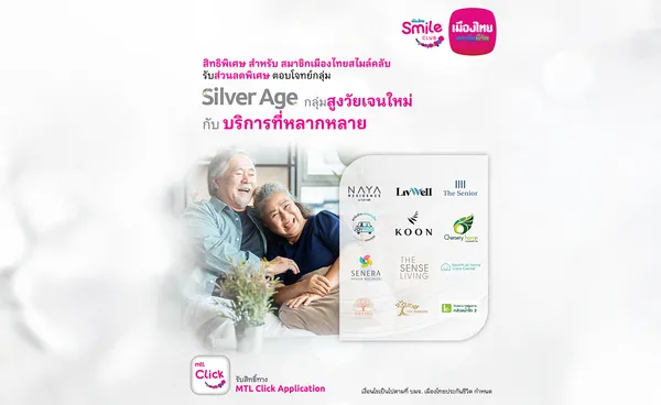 เมืองไทยประกันชีวิตโดย"เมืองไทยสไมล์คลับ"ผนึกกำลังพันธมิตรชั้นนำของประเทศ ตอบโจทย์กลุ่ม Silver Age ด้วยสิทธิพิเศษและบริการที่หลากหลาย ครอบคลุมทั้ง: