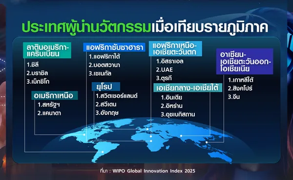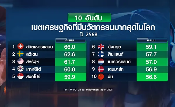 รายงานล่าสุดจัดอันดับดัชนีนวัตกรรมโลก (Global Innovation Index-GII) ประจำปี 2568 ที่มี 139 เขตเศรษฐกิจทั่วโลก โดย “สวิตเซอร์แลนด์” ยังคงอยู่ในอันดับ 1 เป็นปีที่ 15 ติดต่อกันตั้งแต่ปี 2554 สะท้อนความเป็นผู้นำระดับโลกในด้านการสร้างสรรค์ และติด 5 อันดับแรกในเกณฑ์ชี้วัดต่าง ๆ ยกเว้นด้านทุนมนุษย์และการวิจัย ตามด้วย “สวีเดน” และ “สหรัฐฯ” ที่ยังรักษาอันดับเดิมไว้ได้เป็นปีที่ 3 ติดต่อกัน ส่วนอันดับ 4 ได้แก่ เกาหลีใต้ ซึ่งเป็นอันดับสูงสุดที่ทำได้ ครองความเป็นผู้นำในด้านทุนมนุษย์และการวิจัย และอันดับ 5 คือ สิงคโปร์ ที่สามารถทำผลงานโดยรวมได้ดี อยู่ในอันดับ 1 ของเกณฑ์ชี้วัด 10 เกณฑ์จากทั้งหมด 78 เกณฑ์ สำหรับอันดับ 6 ได้แก่ อังกฤษ แข็งแกร่งด้านความสร้างสรรค์ ตามด้วยอันดับ 7 ฟินแลนด์ โดดเด่นในด้านโครงสร้างพื้นฐานนวัตกรรม, อันดับ 8 เนเธอร์แลนด์ มีจุดแข็งด้านระบบนิเวศ และอันดับ 9 เดนมาร์ก ทำได้ดีในแง่การเข้าถึง ICT