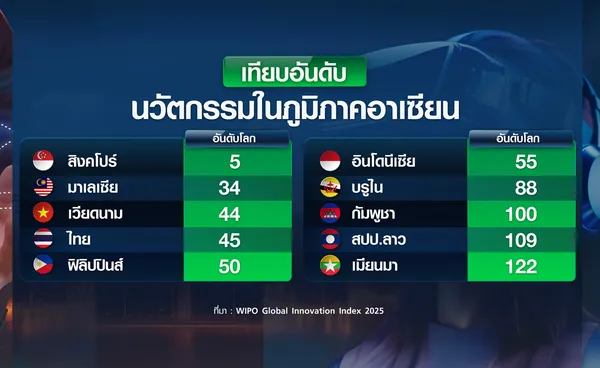 กรณีของ “เวียดนาม” มีการเติบโตด้านนวัตกรรมอย่างรวดเร็ว โดยเฉพาะการส่งออกสินค้าเทคโนโลยีขั้นสูง การผลิตสินค้าเทคโนโลยีที่ทันสมัย และการตีพิมพ์วารสารด้านวิทยาศาสตร์ ส่วน “ฟิลิปปินส์” มีความก้าวหน้าในด้านสิทธิบัตรและวิทยาศาสตร์ ขณะที่ “สิงคโปร์” ยังคงแข็งแกร่งในด้านการผลิตสินค้าเทคโนโลยีขั้นสูง ในส่วนของ “ไทย” แม้จะยังทำผลงานติดกลุ่มผู้นำ แต่เพื่อนบ้านอย่างอินโดนีเซียและฟิลิปปินส์ก็เร่งตีตื้นขึ้นมา ส่งผลให้ไทยต้องเผชิญกับแรงกดดันที่เพิ่มขึ้นในการรักษาความสามารถในการแข่งขัน