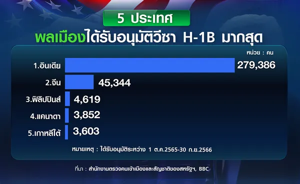 ทั้งนี้ ข้อมูลพบว่า อินเดียเป็นประเทศที่มีแรงงานได้รับวีซ่า H-1B มากสุด 279,386 คน ในระหว่างเดือนตุลาคม ปี 2565-กันยายน ปี 2566 ตามด้วยจีน 45, 344 คน, ฟิลิปปินส์ 4,619 คน, แคนาดา 3,852 คน และเกาหลีใต้ 3,603 คน