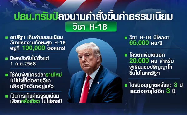 ประธานาธิบดีโดนัลด์ ทรัมป์ ของสหรัฐฯ ยังคงเดินหน้านโยบายจำกัดการเข้าเมืองอย่างถูกกฎหมาย เพื่อไม่ให้แย่งงานชาวอเมริกัน ซึ่งเป็นหนึ่งในวาระหลักนับตั้งแต่เข้ารับตำแหน่งในเดือนมกราคม ล่าสุด เพิ่งลงนามคำสั่งเก็บค่าธรรมเนียมวีซ่าแรงงานต่างชาติทักษะสูงที่เรียกว่า H-1B อยู่ที่ 100,000 ดอลลาร์ เริ่มมีผลบังคับใช้ตั้งแต่วันที่ 21 กันยายน ซึ่งเป็นการปรับขึ้นค่าธรรมเนียมราว 50 เท่า จากเดิมที่เก็บอยู่ราว 2,000-5,000 ดอลลาร์ ขึ้นอยู่กับขนาดของบริษัท ตามข้อมูลของสำนักงานกฎหมาย Immigration Law Group มาตรการดังกล่าวจะกระทบต่อโครงการดึงดูดแรงงานหัวกะทิเข้าไปทำงานในสหรัฐฯ ที่ใช้มาอย่างยาวนาน เพื่อให้นายจ้างสามารถจ้างผู้เชี่ยวชาญชาวต่างชาติที่มีทักษะเฉพาะทางเป็นการชั่วคราว โดยเฉพาะในสาขาวิทยาศาสตร์ เทคโนโลยี วิศวกรรมศาสตร์ และคณิตศาสตร์ (STEM)