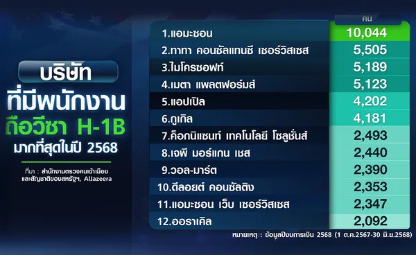 ความเคลื่อนไหวดังกล่าวจะส่งผลกระทบในวงกว้าง โดยเฉพาะในอุตสาหกรรมเทคโนโลยีและการเงินของสหรัฐฯ ซึ่งต้องพึ่งพาแรงงานทักษะสูงจากต่างชาติ ทั้งนี้ ราว 2 ใน 3 ของแรงงานที่ได้รับวีซ่า H-1B ทำงานในอุตสาหกรรมเทคโนโลยี ข้อมูลจากสำนักงานตรวจคนเข้าเมืองและสัญชาติของสหรัฐฯ (U.S. Citizenship and Immigration Services-USCIS) ระบุว่า ในช่วง 3 ไตรมาสแรกของปีงบการเงิน 2568 ซึ่งสิ้นสุดวันที่ 30 มิถุนายนปีนี้ ยักษ์อี-คอมเมิร์ซ “แอมะซอน” มีจำนวนพนักงานที่ได้รับวีซ่า H-1B ราว 10,044 คน ตามด้วยอันดับ 2-4 มีจำนวนกว่า 5,000 คน ได้แก่ “ทาทา คอนซัลแทนซี เซอร์วิสเซส” 5,505 คน, “ไมโครซอฟท์” 5,189 คน, “เมตา แพลตฟอร์มส์” 5,123 คน สำหรับอันดับ 5-6 ได้แก่ “แอปเปิล” 4,202 คน และ “กูเกิล” 4,181 คน ส่วนอันดับ 7-12 อยู่ที่แห่งละกว่า 2,000 คน