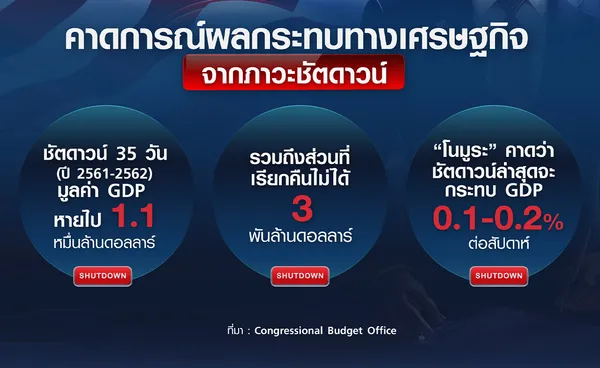 ขณะที่ “โนมูระ” คาดการณ์ว่า ชัตดาวน์รอบล่าสุดนี้จะกระทบ GDP ของสหรัฐฯ ประมาณร้อยละ 0.1-0.2 ต่อสัปดาห์ ด้านสภาที่ปรึกษาเศรษฐกิจแห่งสหรัฐฯ (Council of Economic Advisers) ประเมินว่า สหรัฐฯ อาจสูญเสีย GDP คิดเป็นมูลค่า 1.5 หมื่นล้านดอลลาร์ในแต่ละสัปดาห์ที่ชัตดาวน์ยืดเยื้อออกไป และการปิดทำการนาน 1 เดือนจะส่งผลให้มีผู้ว่างงานเพิ่มขึ้นอีก 43,000 คน ทั้งนี้ ความเสียหายดังกล่าวไม่ได้นับรวมถึงเจ้าหน้าที่พลเรือนของรัฐบาลกลาง 1.9 ล้านคนที่ต้องพักงานหรือทำงานแบบไม่ได้รับค่าจ้าง นอกจากนี้ การชัตดาวน์นาน 1 เดือนจะส่งผลให้การใช้จ่ายของผู้บริโภคลดลง 3 หมื่นล้านดอลลาร์ โดยครึ่งหนึ่งมาจากผลกระทบโดยตรงในส่วนของเจ้าหน้าที่รัฐบาลกลาง และส่วนที่เหลือมาจากผลกระทบที่แผ่ขยายไปยังภาคส่วนอื่น ๆ