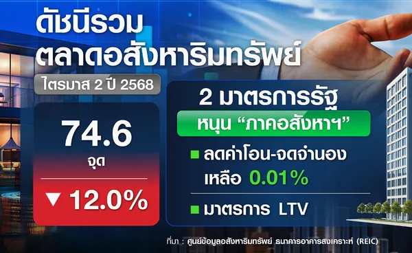 เริ่มจากภาพรวมตลาดอสังหาริมทรัพย์ ของไทยในช่วงไตรมาส 2 ของปี 2568 ที่ผ่านมา จากข้อมูลศูนย์ข้อมูลอสังหาริมทรัพย์ ธนาคารอาคารสงเคราะห์ (REIC) ระบุว่า ดัชนีรวมตลาดอสังหาริมทรัพย์ อยู่ที่ระดับ 74.6 จุด ลดลงร้อยละ -12.0 เมื่อเทียบกับช่วงเดียวกันของปีก่อน ซึ่งสะท้อนถึงการชะลอตัวทั้งด้านอุปสงค์และอุปทานในตลาดที่อยู่อาศัย
