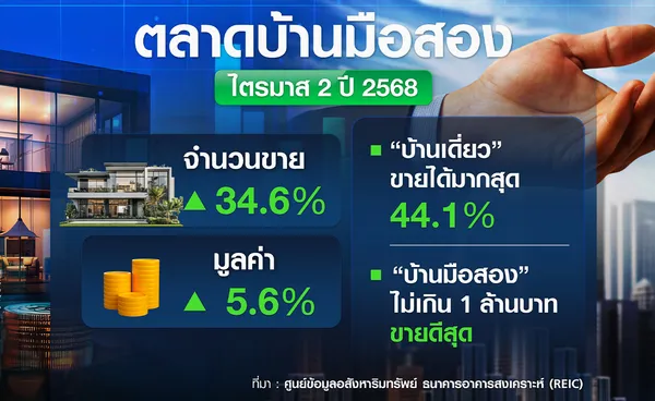 ส่วนตลาดอสังหาริมทรัพย์ที่ดูว่าจะฟื้นตัว คือ ตลาดบ้านมือสอง โดยจากข้อมูล ศูนย์ข้อมูลอสังหาริมทรัพย์ พบว่า ไตรมาส 2 ปี 2568 มีจำนวนหน่วยและมูลค่าประกาศขายเพิ่มขึ้นร้อยละ 34.6 และร้อยละ 5.6 ตามลำดับ เมื่อเทียบกับช่วงเดียวกันของปีก่อน