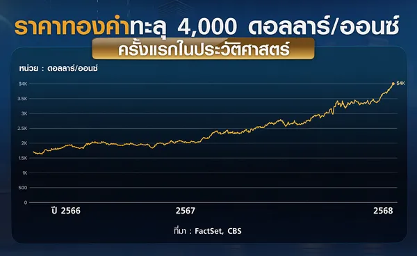 ในช่วง 2 ปีที่ผ่านมา ราคาทองคำเพิ่มขึ้นเท่าตัว และนับตั้งแต่ต้นปีนี้ ราคาทองคำทะยานขึ้นมากกว่าร้อยละ 50 จากที่เคลื่อนไหวแถว 2,600 ดอลลาร์ในเดือนมกราคม จนถึงระดับกว่า 4,000 ดอลลาร์ในเดือนตุลาคม ทั้งนี้ ราคาทองคำที่ขยับขึ้นส่วนใหญ่ได้แรงหนุนจากการเข้ารับตำแหน่งสมัย 2 ของประธานาธิบดีทรัมป์ โดยเฉพาะในเดือนเมษายนที่ราคาทองคำพุ่งขึ้นรวดเร็ว ซึ่งเป็นจังหวะที่ผู้นำสหรัฐฯ เปิดฉากสงครามการค้ากับประเทศต่าง ๆ ไม่ใช่แค่จีน ขณะที่ราคาทะยานขึ้นอีกครั้งในเดือนสิงหาคม หลังจากประธานาธิบดีทรัมป์โจมตีการทำงานของ “เจอโรม พาวเวลล์” ประธานธนาคารกลางสหรัฐฯ (เฟด)