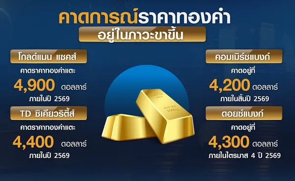 สถาบันการเงินหลายแห่งเริ่มปรับคาดการณ์ราคาทองคำ อาทิ “โกลด์แมน แซคส์” คาดว่า ราคาทองคำอาจพุ่งแตะ 4,900 ดอลลาร์ต่อออนซ์ ภายในเดือนธันวาคม ปี 2569 ส่วน “TD ซิเคียวริตี้ส์” คาดราคาจะขยับแตะ 4,400 ดอลลาร์ ในช่วงครึ่งแรกปี 2569 ด้าน “คอมเมิร์ซแบงก์” ประเมินราคาจะอยู่ที่ 4,200 ดอลลาร์ ภายในสิ้นปี 2569 และ “ดอยซ์แบงก์” คาดการณ์ราคาอยู่ที่ 4,300 ดอลลาร์ ภายในไตรมาส 4 ปี 2569