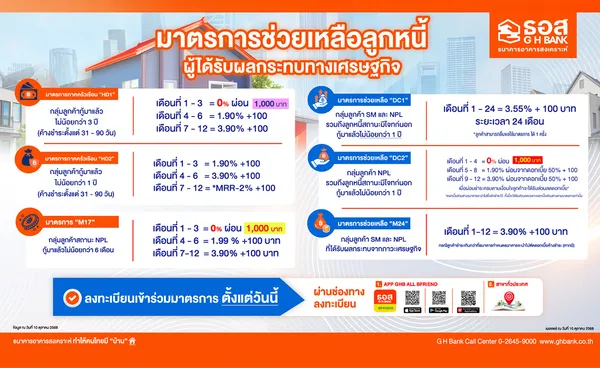 5. มาตรการช่วยเหลือ “M24” สำหรับกลุ่มลูกค้า SM และ NPL ลูกค้ารายย่อย ลูกค้าสวัสดิการ ลูกค้าประเภทแฟลต หรือ ลูกค้าที่ได้รับผลกระทบจากภาวะเศรษฐกิจชะลอตัวและผลกระทบจากสภาวะเศรษฐกิจไทยระยะเวลาให้ความช่วยเหลือ 1 ปี ผ่อนชำระเงินงวดเดือนที่ 1 - 12 คำนวณจากอัตราดอกเบี้ย 3.90% +100 บาท