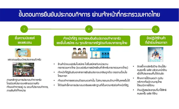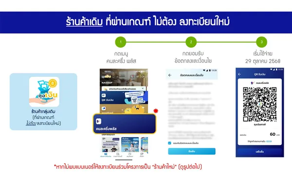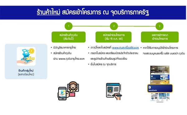 ทั้งนี้ กรณีผู้ประกอบการตามข้อ 2.1 และข้อ 2.2 หากไม่ปรากฏข้อมูลการประกอบกิจการของผู้ประกอบการดังกล่าวในฐานข้อมูลของหน่วยงานภาครัฐ (ไม่มีแบนเนอร์ “คนละครึ่ง พลัส” ขึ้นแสดงในแอปพลิเคชัน “ถุงเงิน”) จะต้องได้รับการยืนยันว่าร้านค้ามีการประกอบกิจการจริงจากเจ้าหน้าที่ที่กระทรวงมหาดไทยหรือกรุงเทพมหานครมอบหมาย แล้วแต่กรณี ก่อน จึงนำใบสมัครไปยื่นผ่านสาขาธนาคารกรุงไทย