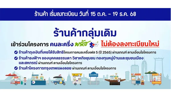 โครงการคนละครึ่ง พลัส (โครงการฯ) จะมีการเปิดลงทะเบียนผู้ประกอบการร้านค้าในวันพรุ่งนี้เป็นวันแรก (วันพุธที่ 15 ตุลาคม 2568) จนถึงวันที่ 19 ธันวาคม 2568 โดยมีรายละเอียดประเภทร้านค้า และการลงทะเบียนร้านค้า ดังนี้