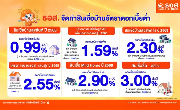 ธนาคารอาคารสงเคราะห์ (ธอส.) จัดทำโปรโมชันสินเชื่ออัตราดอกเบี้ยต่ำสนับสนุนคนไทยมีบ้านเป็นของตนเองส่งท้ายปี 2568 ดันเม็ดเงินลงสู่ภาคอสังหาริมทรัพย์ ส่งผลบวกต่อระบบเศรษฐกิจ ครอบคลุมทุกกลุ่มอาชีพ ลดภาระค่าครองชีพให้กับลูกค้าและประชาชน นำโดยสินเชื่ออัตราดอกเบี้ยเริ่มต้นเพียง 0.99% ต่อปี ผ่อนชำระนานสูงสุด 40 ปี กรณีกู้ 1 ล้านบาท เงินงวดผ่อนชำระเริ่มต้นเพียงเดือนละ 2,600 บาท เท่านั้น! สนใจยื่นคำขอกู้ได้แล้วผ่าน Application : GHB ALL GEN และ ธอส. ทุกสาขาทั่วประเทศ