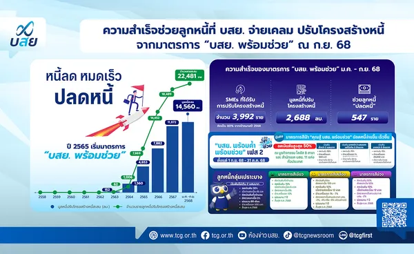 ทั้งนี้ ตั้งแต่เปิดตัวมาตรการ “บสย. พร้อมช่วย” ในปี 2565 จนถึง 30 กันยายน 2568 สามารถปรับโครงสร้างหนี้ 22,481 ราย คิดเป็นมูลหนี้สะสมรวม 14,560 ล้านบาท เฉพาะ 9 เดือนแรกของปี 2568 (ม.ค. – ก.ย.) สามารถปรับโครงสร้างหนี้ 3,992 ราย คิดเป็นมูลหนี้ 2,688 ล้านบาท ในจำนวนนี้เป็น “กลุ่มเปราะบาง” 2,628 ราย ที่สำคัญจากมาตรการนี้ สามารถช่วยลูกหนี้ “ปลดหนี้” ปิดบัญชีได้สำเร็จถึง 547 ราย เพิ่มขึ้นอย่างมีนัยสำคัญ เมื่อเทียบกับปี 2567 ที่สามารถช่วยลูกหนี้ “ปลดหนี้” ได้ 116 ราย สะท้อนถึงความสำเร็จของมาตรการ “บสย. พร้อมช่วย” และตอกย้ำภารกิจของ บสย. ที่ต้องการช่วยต่อลมหายใจให้ SMEs และทำให้ลูกหนี้ที่ถูกจ่ายเคลมมีกำลังใจ กลับมาแข็งแรงได้อีกครั้ง