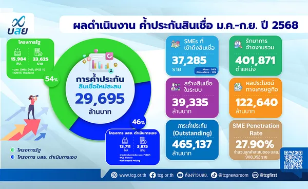 ตลอด 9 เดือนของปี 2568 จากการค้ำประกันสินเชื่อของ บสย. ก่อให้เกิดมูลค่าทางเศรษฐกิจได้มากกว่า 122,640 ล้านบาท ช่วย SMEs ได้รับสินเชื่อเพิ่มขึ้นกว่า 37,285 ราย แบ่งเป็นกลุ่มรายย่อยหรือ Micro SMEs ในสัดส่วนถึง 84% ค้ำประกันสินเชื่อเฉลี่ย 150,000 บาทต่อราย อีก 16% เป็นกลุ่ม SMEs ค้ำประกันสินเชื่อเฉลี่ย 4.4 ล้านบาทต่อราย ก่อให้เกิดสินเชื่อในระบบสถาบันการเงินได้กว่า 39,335 ล้านบาท และช่วยรักษาการจ้างงานรวม 401,871 ตำแหน่ง โดยประเภทธุรกิจที่มียอดค้ำประกันสินเชื่อสูงสุด 3 ลำดับแรก ได้แก่ 1. ภาคบริการ 32.6% 2. อาหารและเครื่องดื่ม 10% และ 3. เกษตรกรรม 7.9% ซึ่งทั้ง 3 ประเภทธุรกิจครองสัดส่วนค้ำประกันถึง 51% สะท้อนถึงแนวโน้มของเม็ดเงินลงทุนของผู้ประกอบการ SMEs ในภาคบริการ อาหาร และธุรกิจท่องเที่ยว ที่เดินหน้าการลงทุน ต่อยอดธุรกิจเพื่อรองรับเม็ดเงินที่จะเข้าสู่ระบบเศรษฐกิจจำนวนมากในช่วงปลายปี