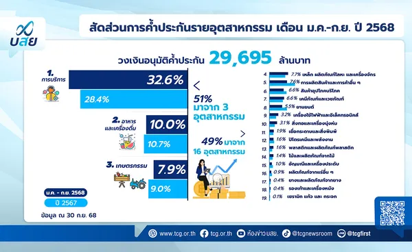 ตลอด 9 เดือนของปี 2568 จากการค้ำประกันสินเชื่อของ บสย. ก่อให้เกิดมูลค่าทางเศรษฐกิจได้มากกว่า 122,640 ล้านบาท ช่วย SMEs ได้รับสินเชื่อเพิ่มขึ้นกว่า 37,285 ราย แบ่งเป็นกลุ่มรายย่อยหรือ Micro SMEs ในสัดส่วนถึง 84% ค้ำประกันสินเชื่อเฉลี่ย 150,000 บาทต่อราย อีก 16% เป็นกลุ่ม SMEs ค้ำประกันสินเชื่อเฉลี่ย 4.4 ล้านบาทต่อราย ก่อให้เกิดสินเชื่อในระบบสถาบันการเงินได้กว่า 39,335 ล้านบาท และช่วยรักษาการจ้างงานรวม 401,871 ตำแหน่ง โดยประเภทธุรกิจที่มียอดค้ำประกันสินเชื่อสูงสุด 3 ลำดับแรก ได้แก่ 1. ภาคบริการ 32.6% 2. อาหารและเครื่องดื่ม 10% และ 3. เกษตรกรรม 7.9% ซึ่งทั้ง 3 ประเภทธุรกิจครองสัดส่วนค้ำประกันถึง 51% สะท้อนถึงแนวโน้มของเม็ดเงินลงทุนของผู้ประกอบการ SMEs ในภาคบริการ อาหาร และธุรกิจท่องเที่ยว ที่เดินหน้าการลงทุน ต่อยอดธุรกิจเพื่อรองรับเม็ดเงินที่จะเข้าสู่ระบบเศรษฐกิจจำนวนมากในช่วงปลายปี