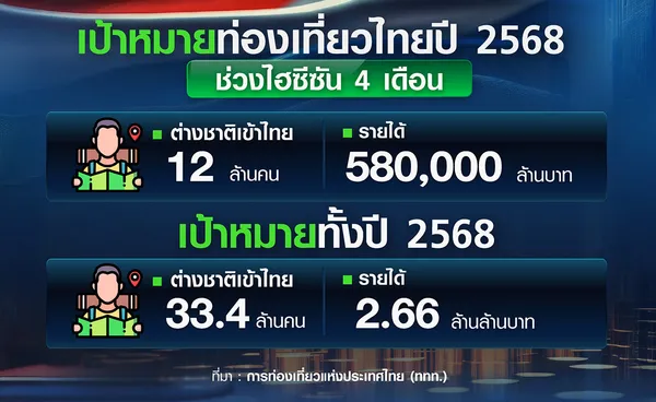 สำหรับปี 2568 ในช่วงฤดูกาลท่องเที่ยว (ไฮซีซั่น) หรือช่วง 4 เดือนสุดท้ายของปี 2568 รัฐบาลชุดใหม่ที่นำโดยนายอนุทิน ชาญวีระกูล ต้องการเห็นการท่องเที่ยวแห่งประเทศไทย (ททท.) ผลักดันจำนวนนักท่องเที่ยวต่างชาติเดินทางเข้าไทย 12 ล้านคน จากปัจจุบันที่มีนักท่องเที่ยวเข้าไทยแล้ว 25 ล้านคน