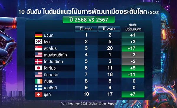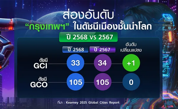 ขยับมาดูไทย “กรุงเทพฯ” สามารถขยับขึ้นมาอยู่อันดับ 33 ในดัชนี GCI ปี 2568 จากที่อยู่อันดับ 34 ในปี 2567 และอันดับ 45 ในปี 2566 โดยหลัก ๆ มาจากกิจกรรมทางธุรกิจที่ดีขึ้น ส่วนดัชนี GCO ในปีนี้ กรุงเทพฯ อยู่อันดับ 105 เท่ากับปีที่แล้วและปี 2566 ทั้งนี้ รายงานระบุด้วยว่า กรุงเทพฯ ควรมุ่งเน้นการเสริมศักยภาพด้านนวัตกรรม ส่งเสริมความยั่งยืนด้านสิ่งแวดล้อม และสร้างความเท่าเทียมทางสังคม เพื่อใช้ประโยชน์จากโอกาสในยุคปัญญาประดิษฐ์ (AI) และการขับเคลื่อนด้วยข้อมูล