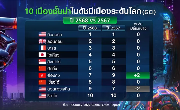รายงาน “เมืองระดับโลก ปี 2568” (2025 Global Cities Report) ที่จัดทำโดย “คาร์นีย์” (Kearney) บริษัทที่ปรึกษาด้านการจัดการระดับโลก ชี้ว่า แม้โลกจะเผชิญกับความผันผวน แต่เมืองระดับโลกในอันดับต้น ๆ ยังคงเป็นแชมป์เก่า สะท้อนถึงความสามารถในการรับมือกับความเปลี่ยนแปลงต่าง ๆ ขณะเดียวกันก็มีเมืองน้องใหม่ที่ทำผลงานได้โดดเด่นเช่นกัน