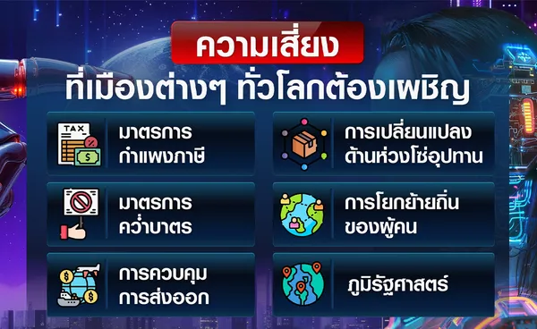 ทั้งนี้ นับเป็นเวลาหลายทศวรรษที่โลกมีกลไกรักษาเสถียรภาพของตลาด ส่งเสริมการค้าโลก และส่งเสริมการเคลื่อนย้ายของผู้คนและเงินทุน แต่กำแพงป้องกันดังกล่าวกำลังถูกกัดกร่อน ท่ามกลางภูมิทัศน์โลกที่เต็มไปด้วยความขัดแย้งและความไม่แน่นอน กรณีที่ชัดเจนสะท้อนจากรัฐบาลสหรัฐฯ ชุดปัจจุบันได้ขยายการใช้มาตรการภาษีศุลกากร มาตรการคว่ำบาตร และการควบคุมการส่งออก เป็นเครื่องมือในการแข่งขันทางภูมิรัฐศาสตร์ ขณะเดียวกัน ก็กระทบต่อห่วงโซ่อุปทานโลกที่เปลี่ยนแปลงไปตามมาตรการกำแพงภาษีและกฎระเบียบที่เปลี่ยนแปลงแบบกะทันหัน ปริมาณสินค้าบริเวณท่าเรือในยุโรป อเมริกาเหนือ และเอเชีย ผันผวนอย่างรุนแรง ส่งผลให้บริษัทต่าง ๆ ต้องเพิ่มความหลากหลายในการจัดหาสินค้าและกำหนดเส้นทางการขนส่งใหม่ รวมถึงการโยกย้ายถิ่นฐานของผู้คนที่เปลี่ยนแปลงไป ซึ่งกระทบต่อแรงงาน
