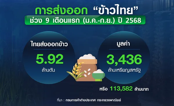 ส่วนถ้ามาดูฝั่งการส่งออกข้าว จะเห็นว่าจาก รายงานข่าวจากกรมการค้าต่างประเทศ กระทรวงพาณิชย์ เปิดเผยถึงการส่งออก ข้าวไทยในช่วง 9 เดือนแรก (ม.ค.-ก.ย.) 2568 ว่า ไทยส่งออกข้าวปริมาณ 5.92 ล้านตัน มูลค่า 3,436 ล้านเหรียญสหรัฐ หรือ 113,582 ล้านบาท