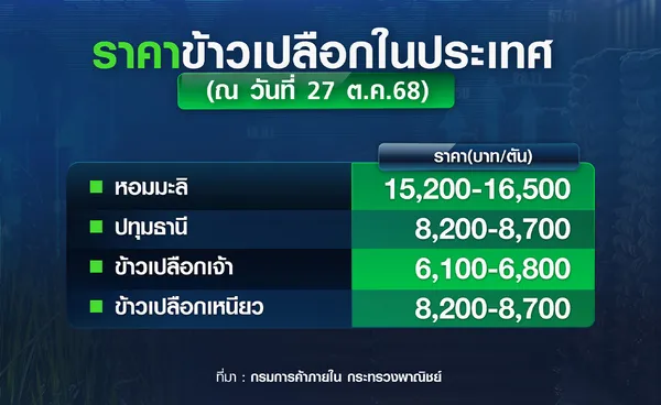 ส่วนราคาข้าวเปลือกไทยในปัจจุบัน (ณ วันที่ 27ต.ค. 68) ข้าวเปลือกหอมมะลิ 15,200-16,500 บาทต่อตัน, ข้าวเปลือกปทุมธานี 8,200-8,700 บาทต่อตัน, ข้าวเปลือกเจ้า 6,100-6,800 บาทต่อตัน, ข้าวเปลือกเหนียว 8,200-8,700 บาทต่อตัน