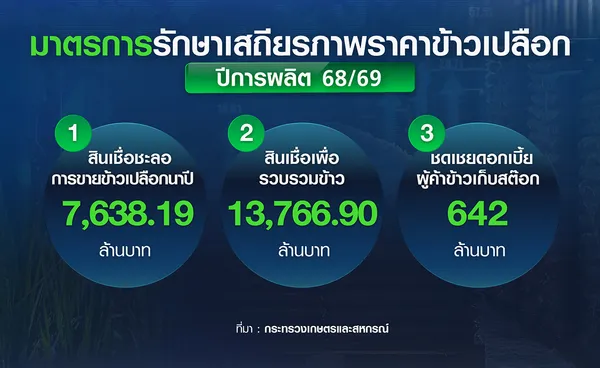 1. โครงการสินเชื่อชะลอการขายข้าวเปลือกนาปี ปีการผลิต 2568/69 โดยกรมส่งเสริมสหกรณ์ ซึ่งมีสหกรณ์และกลุ่มเกษตรกรแสดงความประสงค์เข้าร่วมจำนวนแล้ว 133 แห่ง ในพื้นที่ 37 จังหวัด ใช้วงเงินสินเชื่อรวม 7,638.19 ล้านบาท เพื่อรองรับปริมาณข้าวเปลือกที่จะเข้าร่วมโครงการ 763,819 ตัน ช่วยลดแรงกดดันจากผลผลิตที่ออกสู่ตลาดในช่วงฤดูเก็บเกี่ยว และรักษาเสถียรภาพราคาข้าวในระดับที่เหมาะสม