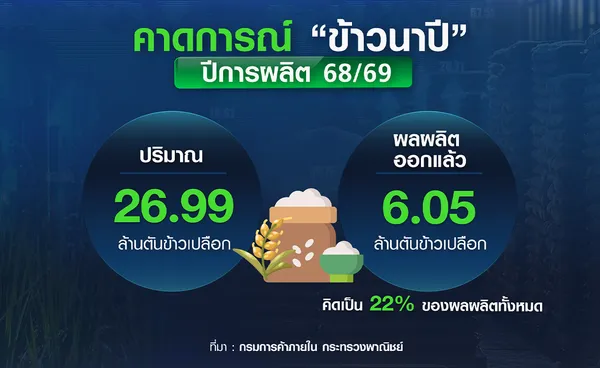 โดยจากข้อมูล กรมการค้าภายใน กระทรวงพาณิชย์ ระบุว่า คาดว่าข้าวนาปี ปีการผลิต 68/69 จะมีปริมาณ 26.99 ล้านตันข้าวเปลือก หรือ 17.54 ล้านตันข้าวสาร โดยปัจจุบันมีผลผลิตออกสู่ตลาดแล้ว 6.05 ล้านตันข้าวเปลือก หรือ 3.9 ล้านตันข้าวสาร หรือคิดเป็นร้อยละ 22 ของผลผลิตทั้งหมด และคาดว่าช่วงเดือนพฤศจิกายนผลผลิตจะออกมามากที่สุด