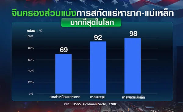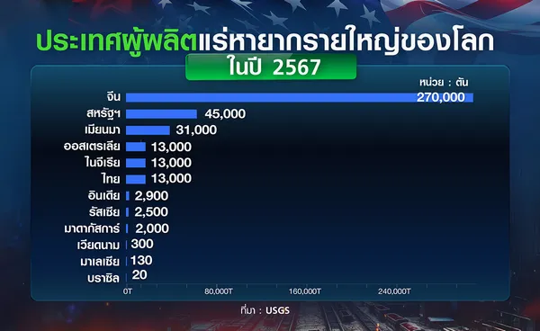 ปัจจุบัน จีนควบคุมห่วงโซ่อุปทานแร่หายากส่วนใหญ่ในโลก ซึ่งแร่หายากเหล่านี้มีความสำคัญมากต่อการผลิตผลิตภัณฑ์หลากหลายประเภท ตั้งแต่เซมิคอนดักเตอร์ สมาร์ตโฟน รถยนต์ไฟฟ้า (EV) ไปจนถึงขีปนาวุธ และในช่วง 2 ปีที่ผ่านมา จีนได้เพิ่มข้อจำกัดในการส่งออกแร่หายาก โดยเฉพาะการนำไปใช้เพื่อวัตถุประสงค์ทางทหาร และถูกมองว่าเป็นเครื่องมือตอบโต้สหรัฐฯ ที่ต้องพึ่งพาแร่หายากจากจีนอย่างมาก ทั้งนี้ สำนักงานสำรวจธรณีวิทยาของสหรัฐฯ (USGS) ระบุว่า ในระหว่างปี 2563-2566 สหรัฐฯ พึ่งพาจีนในการนำเข้าแร่และโลหะหายากมากถึงร้อยละ 70 ของการนำเข้าทั้งหมด
