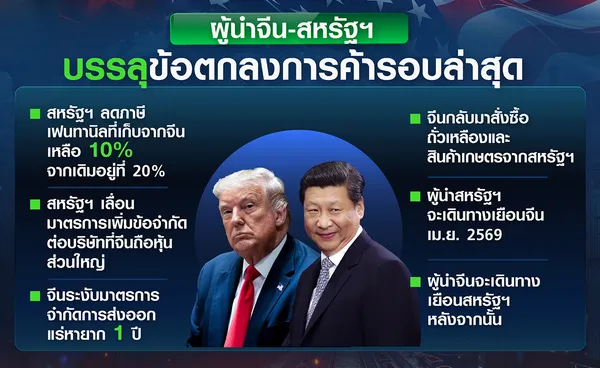 ความตึงเครียดทางการค้ารอบใหม่ระหว่างจีน-สหรัฐฯ ลดอุณหภูมิลงสู่ระดับปกติ หลังจากผู้นำของทั้ง 2 ประเทศบรรลุข้อตกลงร่วมกันในการหารือทวิภาคีที่จัดขึ้นนอกรอบการประชุมสุดยอดผู้นำกลุ่มความร่วมมือทางเศรษฐกิจในภูมิภาคเอเชีย-แปซิฟิก (APEC) ที่เกาหลีใต้ โดยการหารือระหว่างประธานาธิบดีสี จิ้นผิง ของจีน และประธานาธิบดีโดนัลด์ ทรัมป์ ของสหรัฐฯ ที่เมืองปูซาน นับเป็นการพูดคุยกันต่อหน้าครั้งแรกในรอบ 6 ปี กินเวลานานประมาณ 1 ชั่วโมง 40 นาที