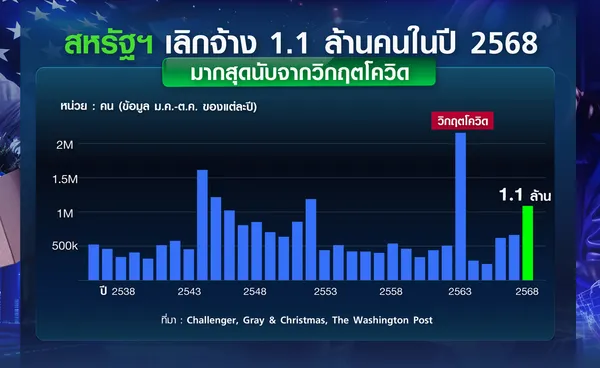 ข้อมูลจาก “ชาเลนเจอร์, เกรย์ แอนด์ คริสต์มาส” (Challenger, Gray & Christmas) ระบุว่า นับตั้งแต่เดือนมกราคม-ตุลาคมปีนี้ บริษัทในสหรัฐฯ ประกาศเลิกจ้างพนักงานไปแล้ว 1.1 ล้านตำแหน่ง เพิ่มขึ้นร้อยละ 65 เมื่อเทียบกับช่วงเดียวกันของปีที่แล้ว ซึ่งอยู่ที่ราว 665,000 ตำแหน่ง ถือเป็นปีที่มีการปลดคนมากที่สุดตั้งแต่วิกฤตโควิดในปี 2563 ซึ่งมีการปลดคนมากกว่า 2.3 ล้านตำแหน่ง และตัวเลขล่าสุดอยู่ในระดับใกล้เคียงกับการเลิกจ้างพนักงานครั้งใหญ่ในช่วงที่สหรัฐฯ เผชิญวิกฤตการเงินเมื่อปี 2551-2552