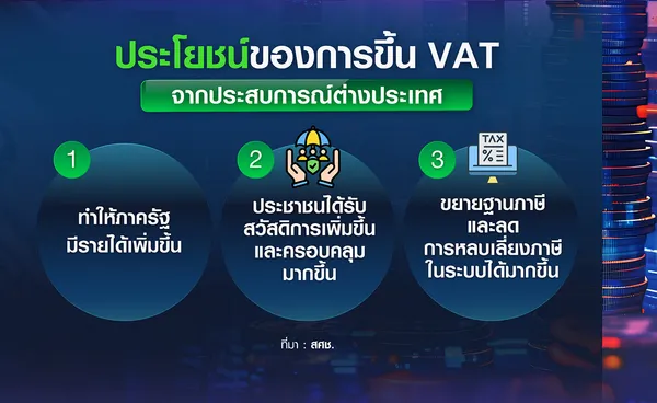 สำหรับประโยชน์ของการขึ้น VAT จากประสบการณ์ต่างประเทศพบว่า 1) ทำให้ภาครัฐมีรายได้เพิ่มขึ้น อาทิญี่ปุ่น ปี 2557 ประกาศขึ้นอัตรา VAT จากร้อยละ 5 เป็นร้อยละ 8 ทำให้รายได้จาก VAT เพิ่มขึ้นเป็น 16 ล้านล้านเยนในปี 2557 จาก 5.2 ล้านล้านเยนในปี 2566