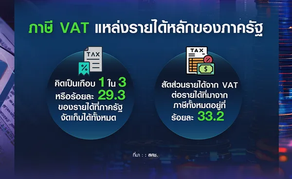 ทั้งนี้ ภาษี VAT ถือเป็นแหล่งรายได้หลักที่สำคัญของภาครัฐ โดยข้อมูลล่าสุดปีงบประมาณ 2568 มีมูลค่าการจัดเก็บ VAT รวมทั้งสิ้น 992,829 ล้านบาท คิดเป็นเกือบ 1 ใน 3 หรือร้อยละ 29.3 ของรายได้ที่ภาครัฐจัดเก็บได้ทั้งหมด (ประกอบด้วย รายได้ที่มาจากภาษีอากร และการนำส่งรายได้จากหน่วยงานภาครัฐ)