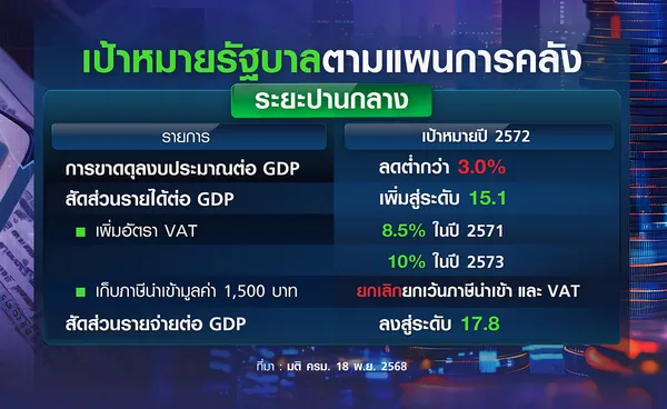 โดยแผนการคลังระยะปานกลางในส่วนของการจัดเก็บรายได้เพิ่มนั้น ได้กำหนดแนวทางการปรับ "เพิ่มภาษี VAT" เป็นมาตรการหนึ่งเพื่อเพิ่มรายภาครัฐ โดยระบุในว่าจะทยอย “ยกเลิก” การปรับลดอัตราภาษีมูลค่าเพิ่มร้อยละ 1.5 หรือเป็นจัดเก็บที่อัตราร้อยละ 8.5 ในปีงบประมาณ 2571 และอีกร้อยละ 1.5 หรือเป็นจัดเก็บที่อัตราร้อยละ 10.0 ในปีงบประมาณ 2573 จากปัจจุบันอัตราภาษี VAT ที่ร้อยละ 7 เป็นอัตราที่รัฐบาลขยายระยะเวลาการปรับลดจากร้อยละ 10 ตั้งแต่ช่วงวิกฤตเศรษฐกิจประเทศปี 2540