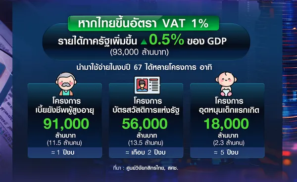 ขณะที่กรณีของประเทศไทย จากงานศึกษาของศูนย์วิจัยกสิกรไทย พบว่า หากมีการปรับขึ้นอัตรา VAT ร้อยละ 1 จะสามารถเพิ่มรายได้ให้รัฐถึงร้อยละ 0.5 ของ GDP หรือประมาณ 93,000 ล้านบาท ซึ่งรายได้ที่เพิ่มขึ้นจะสามารถนำไปใช้จ่ายในโครงการที่สำคัญได้ อาทิ ค่าใช้จ่ายในโครงการยังชีพผู้สูงอายุ (งบประมาณ 91,000 ล้านบาท) โครงการบัตรสวัสดิการแห่งรัฐ (55,800 ล้านบาท) หรือโครงการเงินอุดหนุนเพื่อการเลี้ยงดูเด็กแรกเกิด (17,600 ล้านบาท)