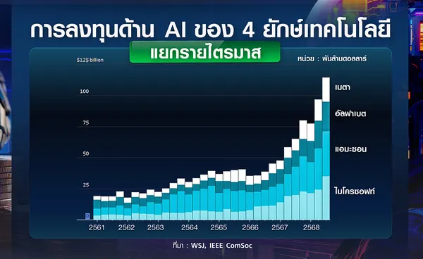 สำหรับบริษัทเทคโนโลยีที่มีมูลค่าตลาดอยู่ในอันดับต้น ๆ 4 แห่ง ทั้ง “เมตา แพลตฟอร์มส์” (Meta) บริษัทแม่ “เฟซบุ๊ก”, “อัลฟาเบต” (Alphabet) บริษัทแม่ “กูเกิล”, “ไมโครซอฟท์” และ “แอมะซอน” (Amazon) ประกาศแผนลงทุนด้าน AI รวมประมาณ 4 แสนล้านดอลลาร์ในปีนี้ และมีแนวโน้มจะเพิ่มการลงทุนในปี 2569