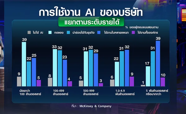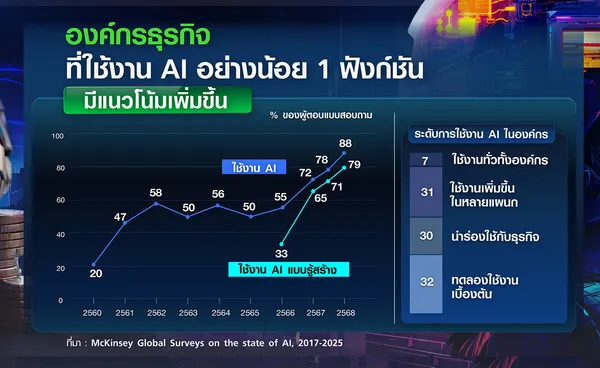 ความแพร่หลายของ AI มีส่วนเปลี่ยนแปลงวิถีชีวิตและการทำงานของผู้คนไปจากเดิม รายงาน “สถานะของ AI ในปี 2568” (The state of AI in 2025: Agents, innovation, and transformation) ของ “แมคคินซีย์ แอนด์ คอมพานี” (McKinsey & Company) พบว่า การใช้งาน AI ทั่วโลกยังคงเพิ่มขึ้นอย่างต่อเนื่อง โดยร้อยละ 88 ของผู้ตอบแบบสอบถามระบุว่า องค์กรของตนมีการใช้งาน AI อย่างน้อย 1 ฟังก์ชันในการทำงาน เพิ่มขึ้นจากร้อยละ 78 ในปีที่แล้ว แต่ส่วนใหญ่หรือราวร้อยละ 62 ยังอยู่แค่ระยะทดลอง มีเพียงร้อยละ 31 ที่ขยายการใช้งานในหลากหลายแผนก