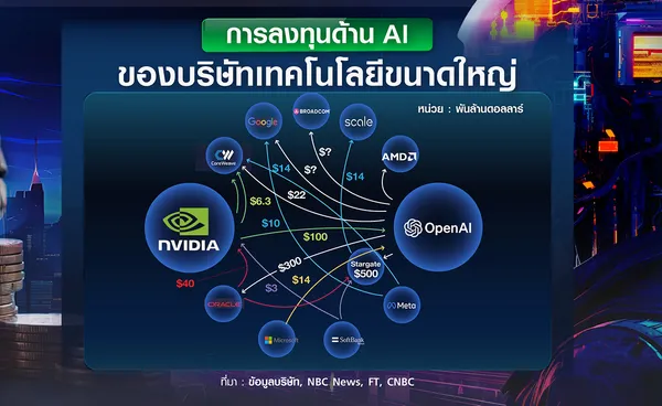 อย่างเมื่อเดือนกันยายน OpenAI ยืนยันจะลงทุน 3 แสนล้านดอลลาร์ใน “ออราเคิล” (Oracle) เพื่อเพิ่มศักยภาพด้านโครงสร้างพื้นฐานการประมวลผลเป็นระยะเวลากว่า 5 ปี ซึ่งนี่เป็นส่วนหนึ่งของโครงการสร้าง Data Center ขนาดยักษ์ที่เรียกว่า “สตาร์เกต” (Stargate) มูลค่า 5 แสนล้านดอลลาร์ที่มีบริษัท “ซอฟต์แบงก์” ของญี่ปุ่นร่วมด้วย นอกจากนี้ OpenAI ยังทำข้อตกลง 2.2 หมื่นล้านดอลลาร์ เพื่อใช้บริการโครงสร้างพื้นฐานการประมวลผลจาก “คอร์วีฟ” (CoreWeave) ซึ่งใช้ชิปประมวลผลกราฟิกของ Nvidia ขณะเดียวกัน OpenAI ก็ประกาศความร่วมมือในการพัฒนาและติดตั้งชิปของ “บรอดคอม” (Broadcom) ซึ่งยังไม่มีการเปิดเผยมูลค่าข้อตกลง ในทางกลับกัน Nvidia ลงทุนใน OpenAI ราว 1 แสนล้านดอลลาร์ แต่ส่วนใหญ่ก็นำไปใช้เช่าชิป GPU ของ Nvidia เอง ส่วน “ไมโครซอฟท์” (Microsoft) ลงทุนใน OpenAI ราว 1.4 หมื่นล้านดอลลาร์ นับตั้งแต่ปี 2562
