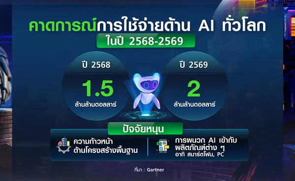 บริษัทวิจัยข้อมูลด้านธุรกิจ “การ์ตเนอร์” (Gartner) ประเมินว่า การใช้จ่ายด้านปัญญาประดิษฐ์ (AI) ทั่วโลกน่าจะมีมูลค่าราว 1.5 ล้านล้านดอลลาร์ในปี 2568 และจะยังคงลงทุนอย่างต่อเนื่องในการขยายโครงสร้างพื้นฐานด้าน AI เนื่องจากผู้ให้บริการรายใหญ่ยังคงเพิ่มการลงทุนเกี่ยวกับศูนย์ข้อมูล (Data Center) ที่มีฮาร์ดแวร์และหน่วยประมวลผลกราฟิก (graphics processing unit-GPU) ที่ปรับให้เหมาะสมกับ AI เพื่อขยายบริการให้รองรับความต้องการที่เพิ่มขึ้น