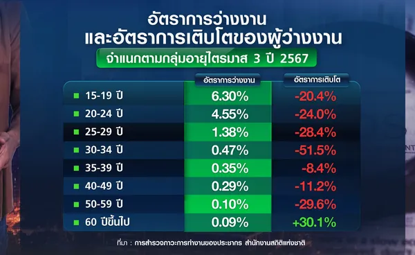 แม้ว่าแนวโน้มผู้ว่างงานในภาพรวมจะลดลงจากไตรมาสเดียวกันของปีก่อนหน้า แต่เมื่อจำแนกตามกลุ่มอายุพบว่า ผู้ว่างงานในกลุ่มผู้สูงอายุ (อายุ 60 ปีขึ้นไป) มีอัตราการว่างงานร้อยละ 0.09 ต่ำที่สุดเมื่อเทียบกับกลุ่มอายุอื่นๆ แต่มีอัตราการเพิ่มขึ้นมากที่สุดถึงร้อยละ 30.1 จากช่วงเดียวันปีก่อน ขณะที่กลุ่มอายุอื่นๆ ปรับลดลง