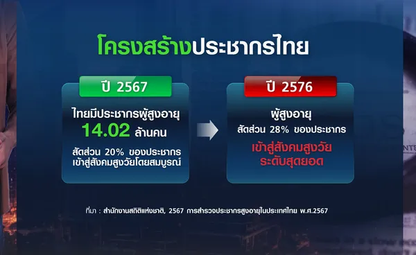 โดยข้อมูลจากสำนักงานสถิติแห่งชาติปี 2567 ระบุว่า ไทยเข้าสู่สังคมสูงวัยโดยสมบูรณ์ โดยไทยมีจำนวนประชากรผู้สูงอายุเกิน 60 ปีมากถึง 14.02 ล้านคน หรือคิดเป็นร้อยละ 20 ของประชากรทั้งหมด และมีแนวโน้มเป็นสังคมสูงวัยระดับสุดยอด (Super Aged Society) หรือมีประชากรอายุ 60 ปีขึ้นไป มีสัดส่วนมากกว่าร้อยละ 28 ของประชากรทั้งหมด ภายในปี 2576
