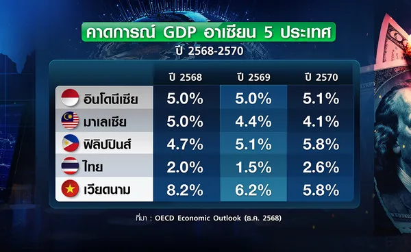 รายงานฉบับนี้ OECD ยังได้คาดการณ์การเติบโตของ GDP ของประเทศขนาดใหญ่ในกลุ่มอาเซียน ซึ่งไทยยังคงมีแนวโน้มเติบโตตามหลังเพื่อนบ้าน โดย “อินโดนีเซีย” มีแนวโน้มโตที่ร้อยละ 5.0 ในปี 2569 และขยับเป็นร้อยละ 5.1 ในปี 2570 ส่วนมาเลเซียน่าจะโตร้อยละ 4.4 ในปี 2569 ก่อนจะชะลอเหลือร้อยละ 4.1 ในปี 2570 ด้านฟิลิปปินส์มีแนวโน้มที่จะขยายตัวร้อยละ 5.1 ในปีนี้ และขยับขึ้นที่ร้อยละ 5.8 ในปี 2570 ส่วนเศรษฐกิจเวียดนามมีแนวโน้มขยายตัวร้อยละ 6.2 ในปี 2569 จากนั้นจะชะลอเหลือร้อยละ 5.8 ในปี 2570 ขณะที่ไทยมีแนวโน้มจะขยายตัวที่ร้อยละ 1.5 ในปี 2569 ก่อนจะขยับขึ้นแตะร้อยละ 2.6 ในปี 2570