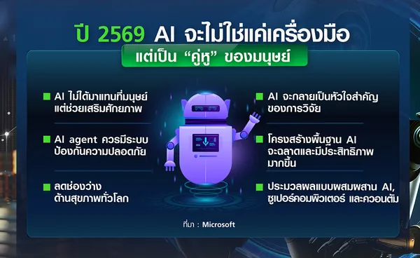 “ไมโครซอฟท์” คาดการณ์แนวโน้ม AI ในปี 2569 ซึ่งจะเป็นยุคใหม่ของ AI โดยเปลี่ยนผ่านจากการเป็น “เครื่องมือ” ไปสู่การเป็น “คู่หู” ของมนุษย์ โดยในอนาคต AI จะไม่ได้แทนที่มนุษย์ แต่จะช่วยเสริมศักยภาพของมนุษย์ ดังนั้น อย่าแข่งขันกับ AI แต่ควรมุ่งเน้นไปที่การเรียนรู้วิธีการทำงานร่วมกัน นอกจากนี้ AI agent ควรมีระบบป้องกันความปลอดภัยเพื่อไม่ให้เกิดความเสี่ยง ขณะเดียวกัน AI ก็ช่วยลดช่องว่างด้านสุขภาพของโลก ซึ่งขณะนี้ AI พัฒนาไกลกว่าการวินิจฉัยโรค ไปสู่การคัดกรองอาการและวางแผนการรักษา ทั้งนี้ คาดว่า ทั่วโลกจะขาดแคลนบุคลากรทางการแพทย์ถึง 11 ล้านคน ภายในปี 2573 เทคโนโลยี AI จึงอาจช่วยแก้ปัญหาช่องว่างดังกล่าวที่จะกระทบต่อประชากร 4.5 พันล้านคนทั่วโลก