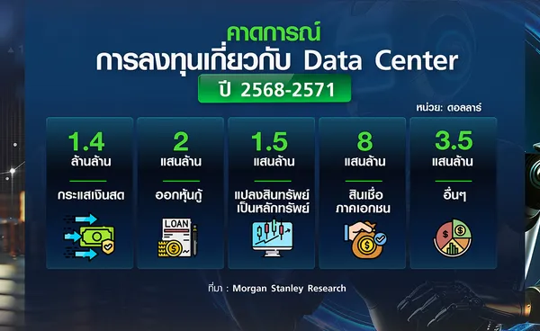 ด้าน “มอร์แกน สแตนเลย์” ประเมินว่า การใช้จ่ายด้าน Data Center ทั่วโลกมีแนวโน้มจะแตะ 3 ล้านล้านดอลลาร์ นับตั้งแต่ปัจจุบันไปจนถึงปี 2571 ซึ่งราว ๆ 1.4 ล้านล้านดอลลาร์ มาจากกระแสเงินสดของบริษัทผู้ให้บริการคลาวด์ที่มี Data Center ขนาดใหญ่ของสหรัฐฯ หรือที่เรียกว่า “ไฮเปอร์สเกลเลอร์” (Hyperscaler) ส่วนอีก 1.5 ล้านล้านดอลลาร์ จะมาจากแหล่งอื่น ๆ อาทิ สินเชื่อภาคเอกชนที่ไม่ใช่ธนาคาร ซึ่งสามารถอุดช่องว่างทางการเงินได้มากกว่าครึ่งหนึ่ง หรือราว 8 แสนล้านดอลลาร์ กรณี “เมตา แพลตฟอร์มส์” ของ “มาร์ก ซักเคอร์เบิร์ก” ก็ระดมทุนจากตลาดสินเชื่อเอกชนเป็นจำนวน 2.9 หมื่นล้านดอลลาร์ สำหรับขยาย Data Center ในรัฐหลุยเซียนาของสหรัฐฯ