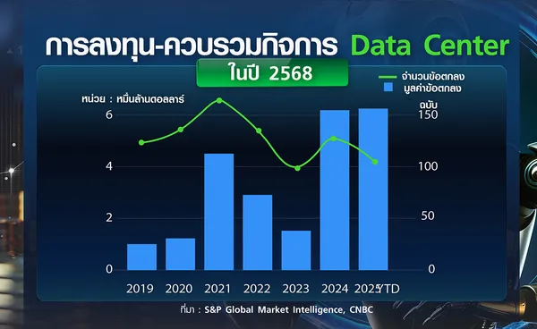 “S&P โกลบอล” ประเมินว่า ในช่วง 11 เดือนแรกของปีนี้ เม็ดเงินที่เข้าสู่ตลาด Data Center อยู่ที่ราว 6.1 หมื่นล้านดอลลาร์ สูงกว่าเมื่อเทียบกับทั้งปี 2567 ที่อยู่ที่ 6.08 หมื่นล้านดอลลาร์ นอกจากนี้ จำนวนข้อตกลงเกี่ยวกับ Data Center อยู่ที่ 104 ธุรกรรม ส่วนใหญ่เกิดขึ้นในสหรัฐฯ ตามด้วยภูมิภาคเอเชีย-แปซิฟิก ส่วนยุโรปมีแนวโน้มที่ Data Center จะขยายตัวในอัตราที่ต่ำกว่าภูมิภาคอื่น ๆ
