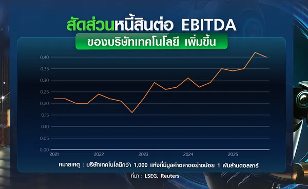 จากการวิเคราะห์ของ “รอยเตอร์ส” เกี่ยวกับบริษัทเทคโนโลยีมากกว่า 1,000 แห่งที่มีมูลค่าตลาดอย่างน้อย 1 พันล้านดอลลาร์ พบว่า ค่ามัธยฐานของอัตราส่วนหนี้สินต่อกำไรก่อนหักดอกเบี้ย ภาษีเงินได้ ค่าเสื่อมราคา และค่าตัดจำหน่าย (debt-to-EBITDA ratio) เพิ่มขึ้นเป็น 0.4 นับถึงสิ้นเดือนกันยายนที่ผ่านมา คิดเป็นเกือบ 2 เท่าของระดับที่หนี้พุ่งสูงในปี 2563 ถึงแม้ว่าภาระหนี้จะยังคงต่ำกว่าระดับที่น่าเป็นห่วง แต่การเพิ่มขึ้นดังกล่าวสะท้อนว่า หนี้สินเพิ่มขึ้นเร็วกว่ากำไร ซึ่งอาจก่อให้เกิดความเสี่ยงได้หากกระแสเงินสดไม่เพิ่มตาม และจะเป็นความเสี่ยงเชิงโครงสร้างที่จะกระทบต่อเศรษฐกิจโลกโดยรวม ไม่ใช่แค่อุตสาหกรรมเทคโนโลยี