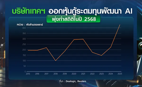 ข้อมูลจาก “S&P โกลบอล” สอดคล้องกับการประเมินของ “ดีลอจิก” ที่ว่า บริษัทเทคโนโลยีก่อหนี้ด้วยการออกหุ้นกู้มากเป็นประวัติการณ์ เนื่องจากผู้ให้บริการ Data Center ขนาดใหญ่หันมาระดมทุนในการสร้างโครงสร้างพื้นฐานที่มีราคาแพง แทนที่จะใช้เงินของตัวเอง โดย “เมตา แพลตฟอร์มส์” (Meta) บริษัทแม่ของ “เฟซบุ๊ก” และ “กูเกิล” (Google) ในเครือ “อัลฟาเบต” เป็นหนึ่งในผู้ออกหุ้นกู้มากที่สุดอันดับต้น ๆ ทั้งนี้ “เมตา” ระดมทุนได้ 6.2 หมื่นล้านดอลลาร์ จากการออกหุ้นกู้ตั้งแต่ปี 2565 ซึ่งเกือบครึ่งหนึ่งของยอดดังกล่าวออกในปี 2568 เพียงปีเดียว ด้าน “กูเกิล” ระดมทุนได้ 2.9 หมื่นล้านดอลลาร์ และ “แอมะซอน” ยักษ์อี-คอมเมิร์ซระดมทุนได้ราว 1.5 หมื่นล้านดอลลาร์