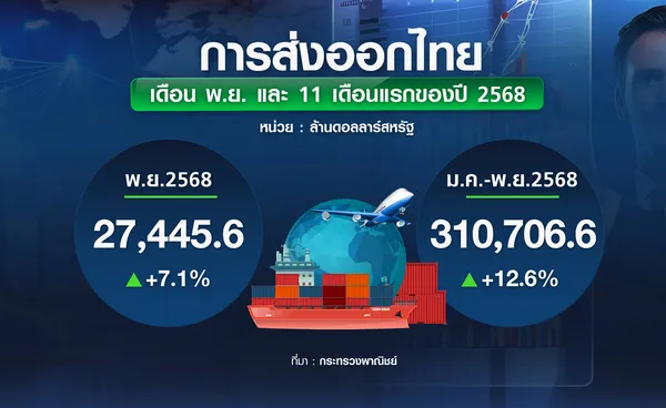 ตัวเลขการส่งออกสินค้าของไทยเดือน พ.ย. 2025 อยู่ที่ 27,445.6 ล้านดอลลาร์สหรัฐ ขยายตัว ร้อยละ 7.1 จากช่วงเดียวกันปีก่อน แม้จะขยายตัวต่อเนื่องเป็นเดือนที่ 17 แต่เริ่มเห็นถึงสัญญาณการชะลอตัวชัดเจนมากขึ้น สะท้อนจากการส่งออกปรับฤดูกาลที่หดตัวร้อยละ 2.3 เมื่อเทียบจากเดือนก่อนหน้า (MOM_SA )ต่อเนื่องจากหดตัวร้อยละ 1.2 MOM_SA ในเดือนก่อน
