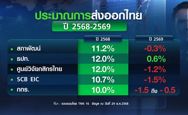 จากการส่งออก 11 เดือนแรกของปี 2568 ทำให้หลายหน่วยงานประมาณการส่งออกปีนี้น่าจะเติบโตสูงเป็นตัวเลขสองหลัก แต่มองแนวโนมปี 2569 จะชะลอลงชัดเจน และมีความเสี่ยงพลิกเป็นติดลบ จากแรงกดดันหลักจากมาตรการภาษีของสหรัฐฯ ที่มีแนวโน้มขยายขอบเขตสินค้าที่ปรับขึ้นภาษีนำเข้าภายใต้มาตรา 232